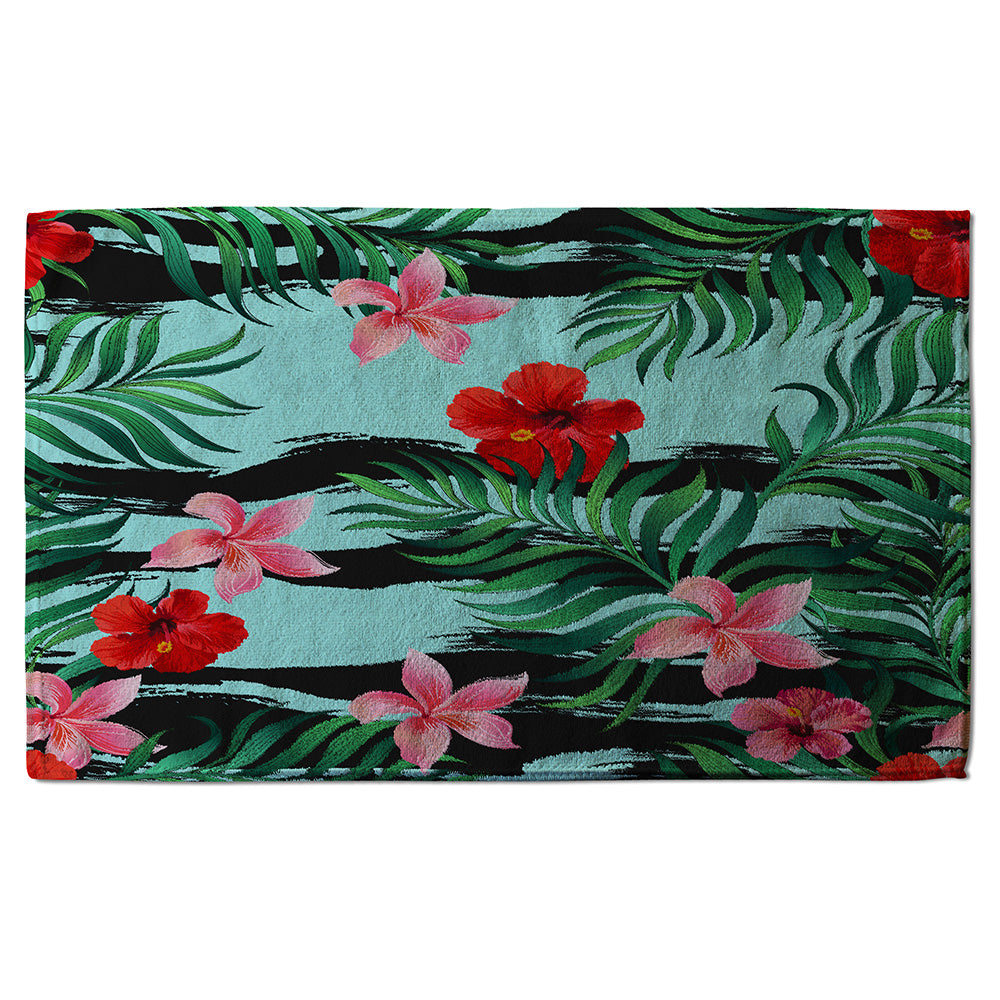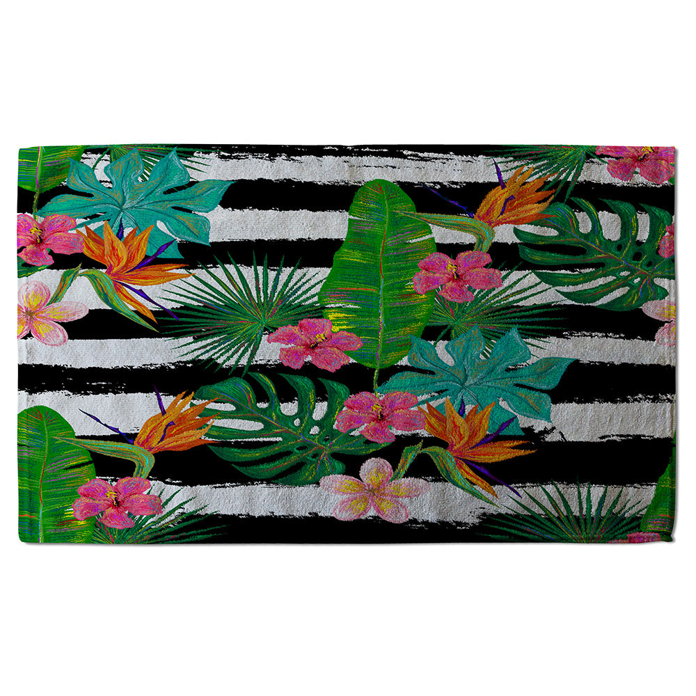 Tropical Plants on Black & White Stripes (Bath Towel)
