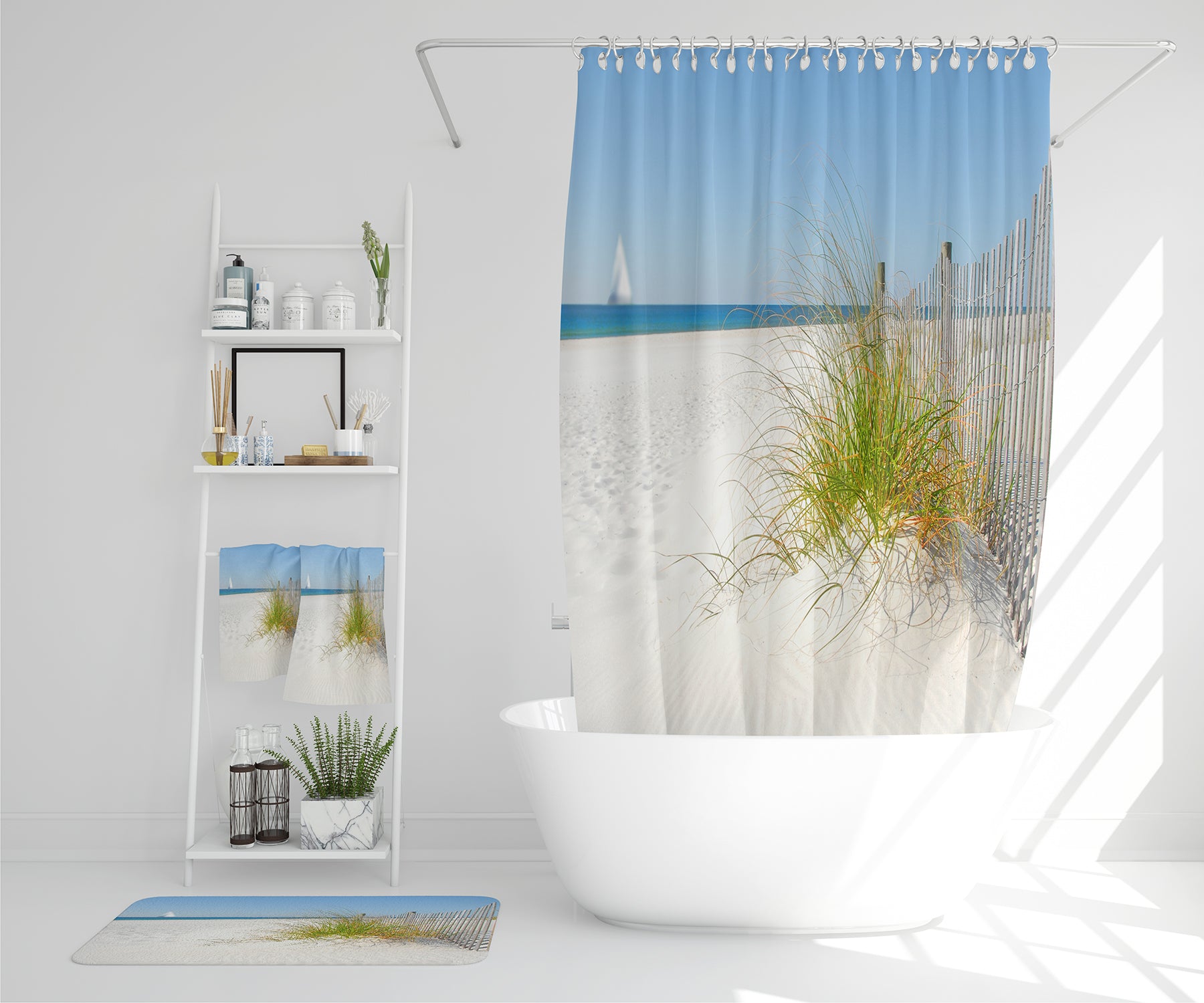 Beautiful sand dune fence by sea grass with sailboat on horizon (Bathroom Set)