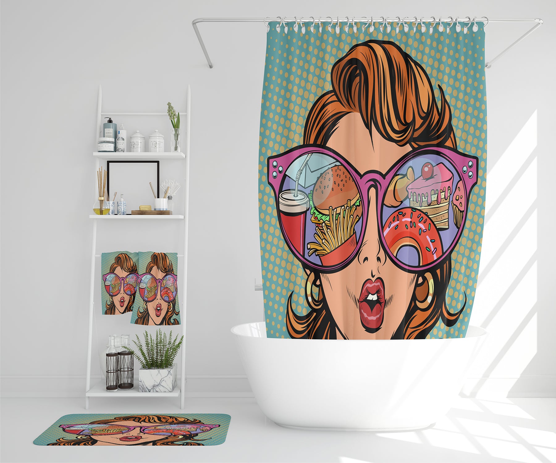 Woman with sunglasses. Fast food and sweets in the reflection (Bathroom Set)