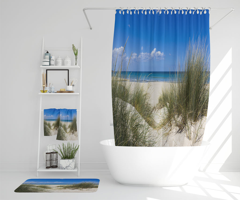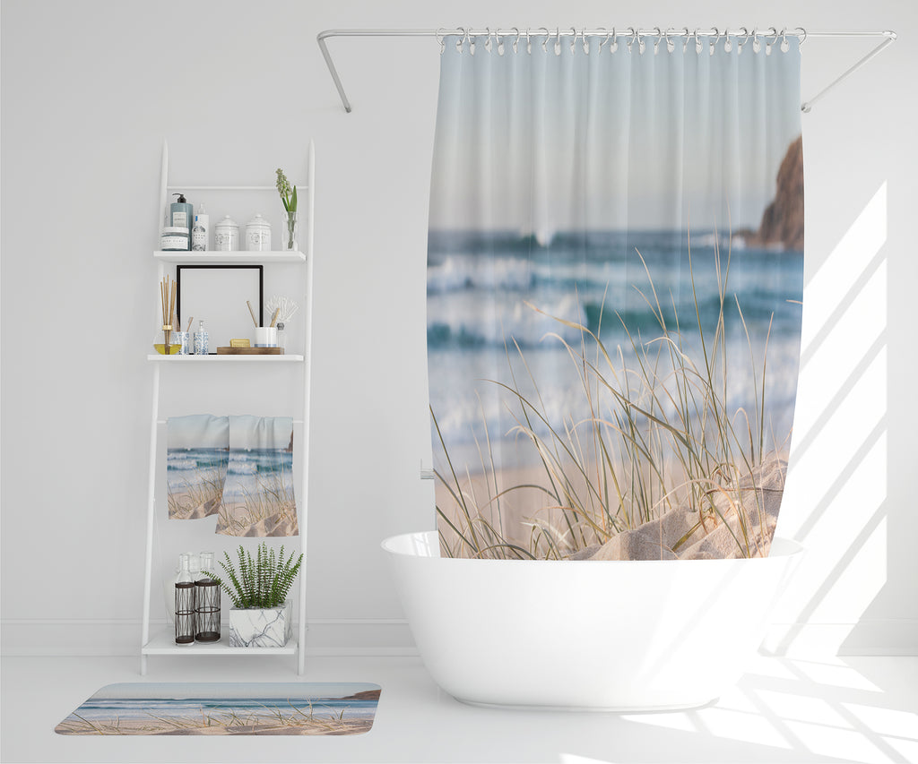 sunrise light on white sand beach with dune grass in Australia with turquoise surf waves of the pacific ocean (Bathroom Set)