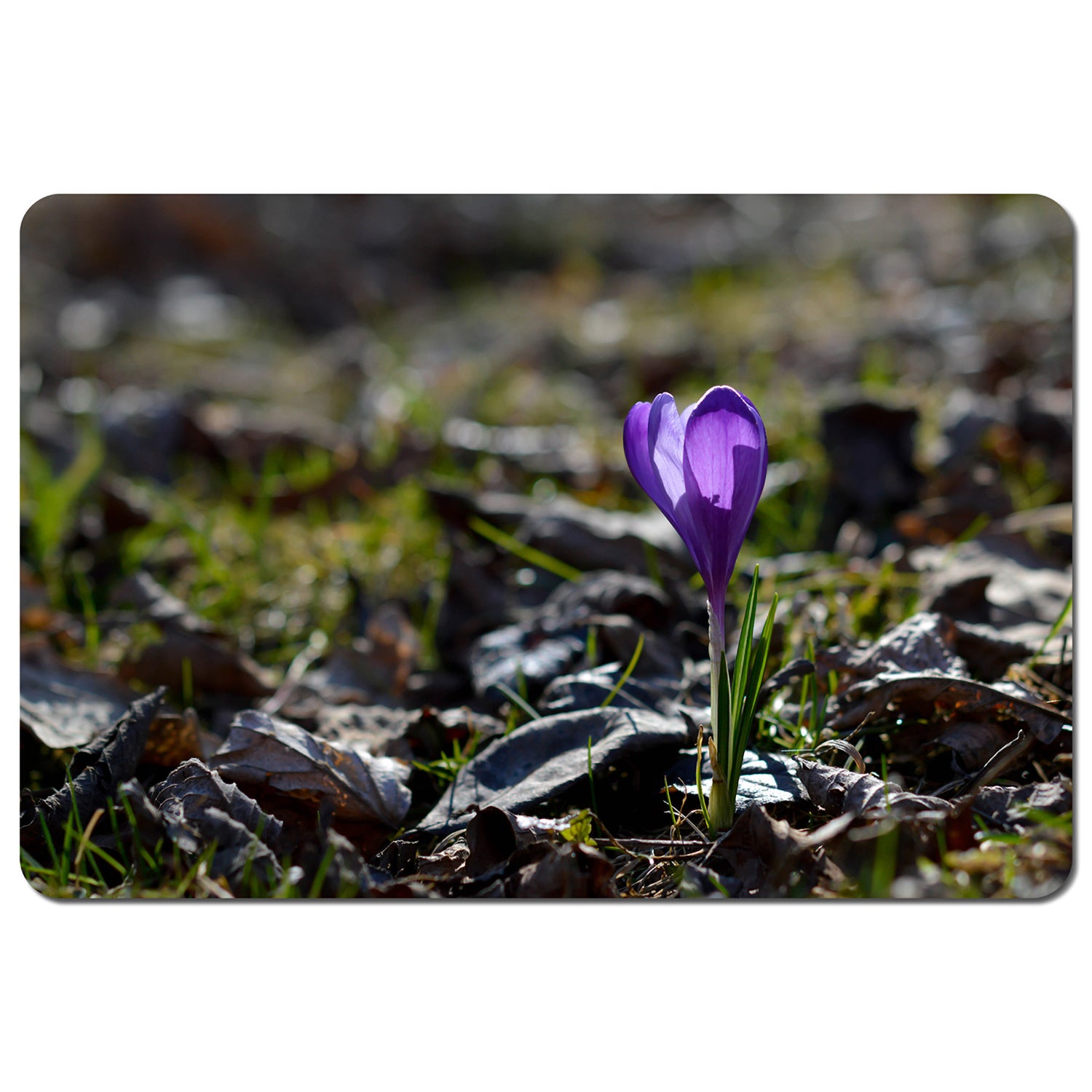 Purple crocus flowers, Colchicum, in a green grass meadow. Close up spring or autumn flower bloom in nature (Placemat)