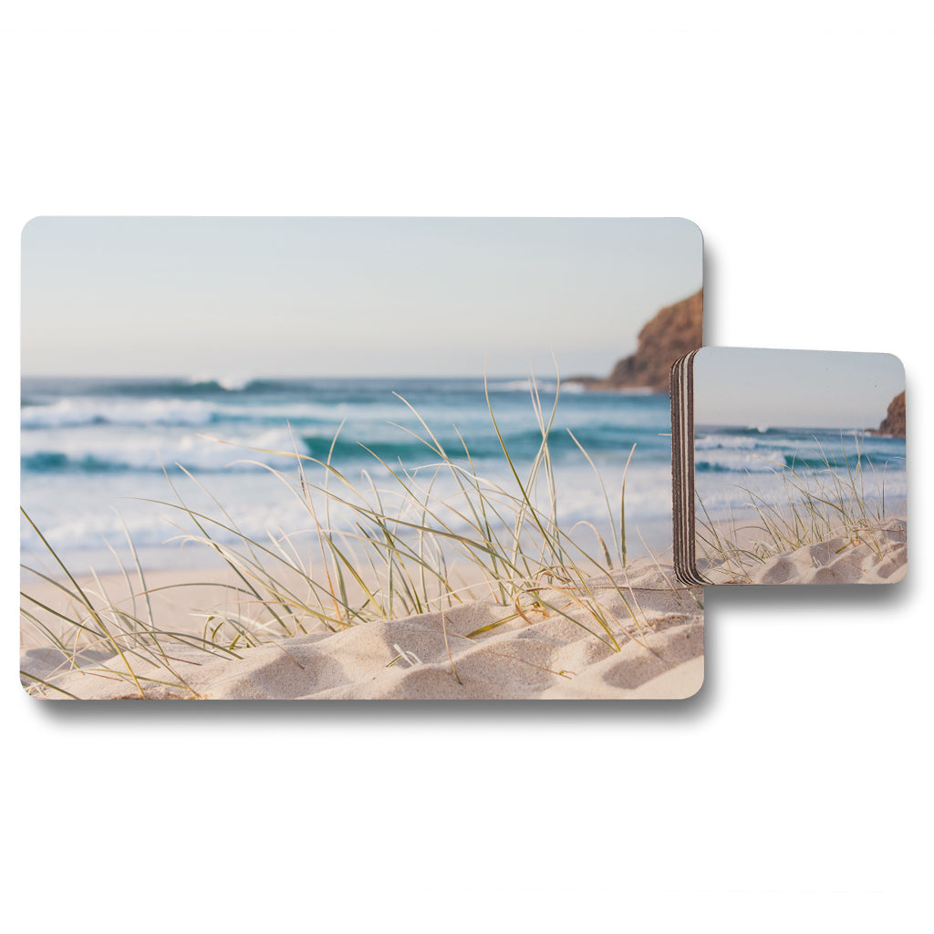 sunrise light on white sand beach with dune grass in Australia with turquoise surf waves of the pacific ocean (Placemat & Coaster Set)