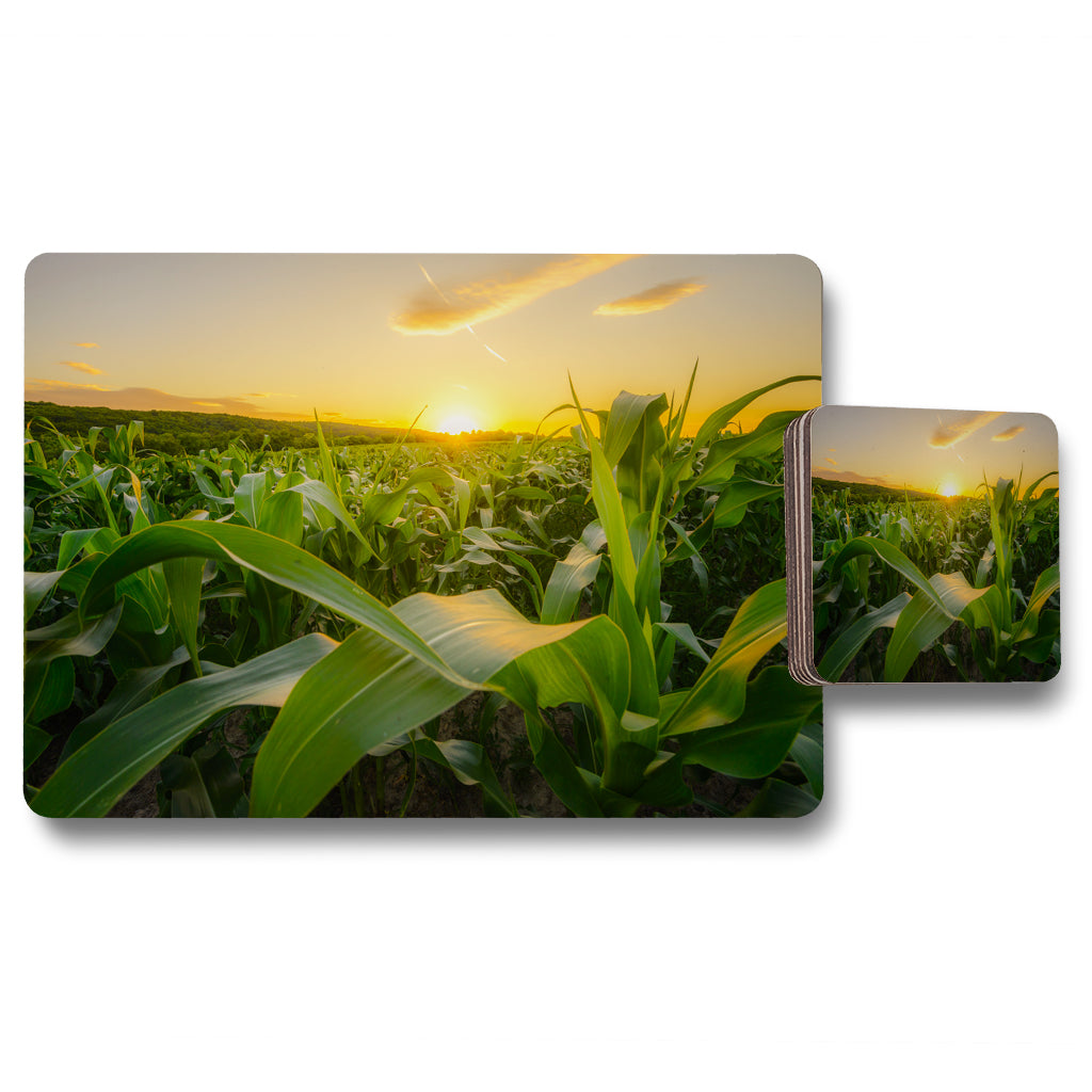 Young green corn growing on the field at sunset (Placemat & Coaster Set) (Placemat & Coaster Set)
