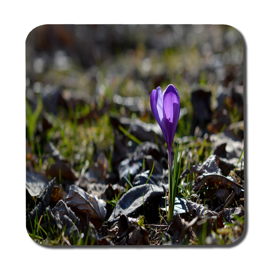 Purple crocus flowers, Colchicum, in a green grass meadow. Close up spring or autumn flower bloom in nature (Coaster)