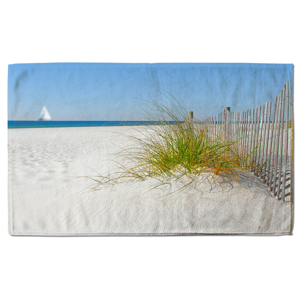 Beautiful sand dune fence by sea grass with sailboat on horizon (Bath Towel)