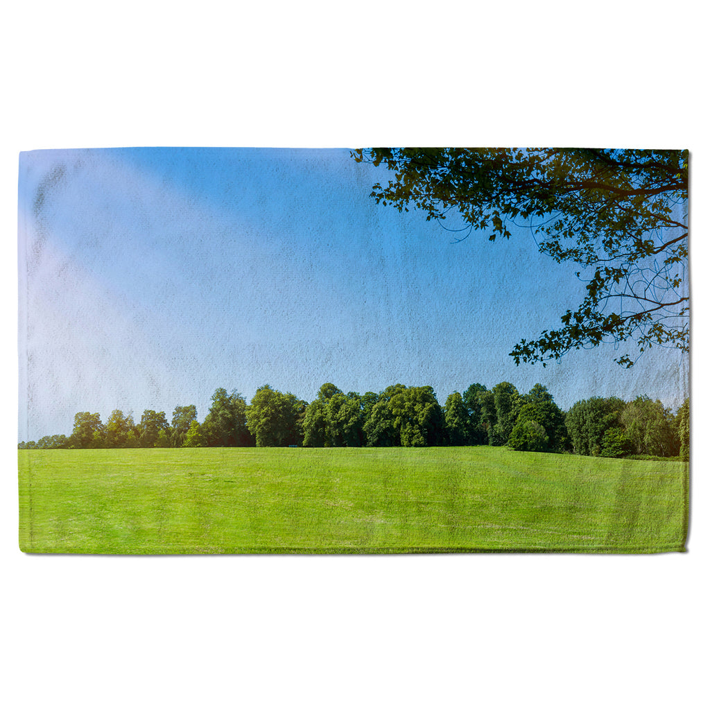 Beauty landscape of grass field with forest trees and environment public park with sun rays (Bath Towel)