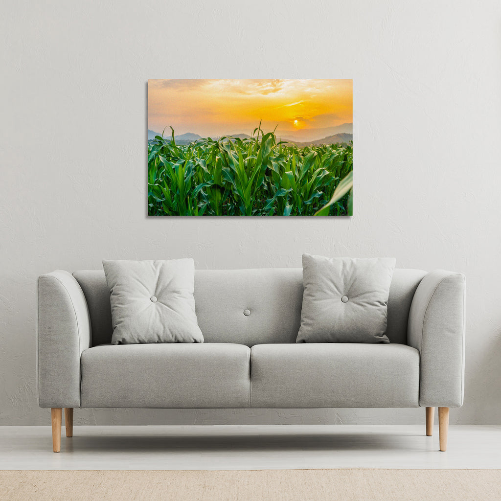 green corn field in agricultural garden and light shines sunset (Canvas Print)