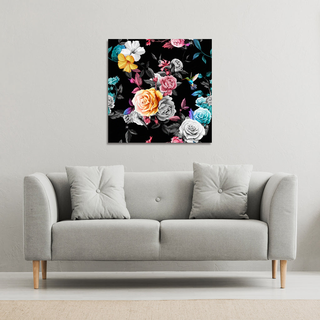 Humming bird, roses, peony with leaves (Canvas Print)
