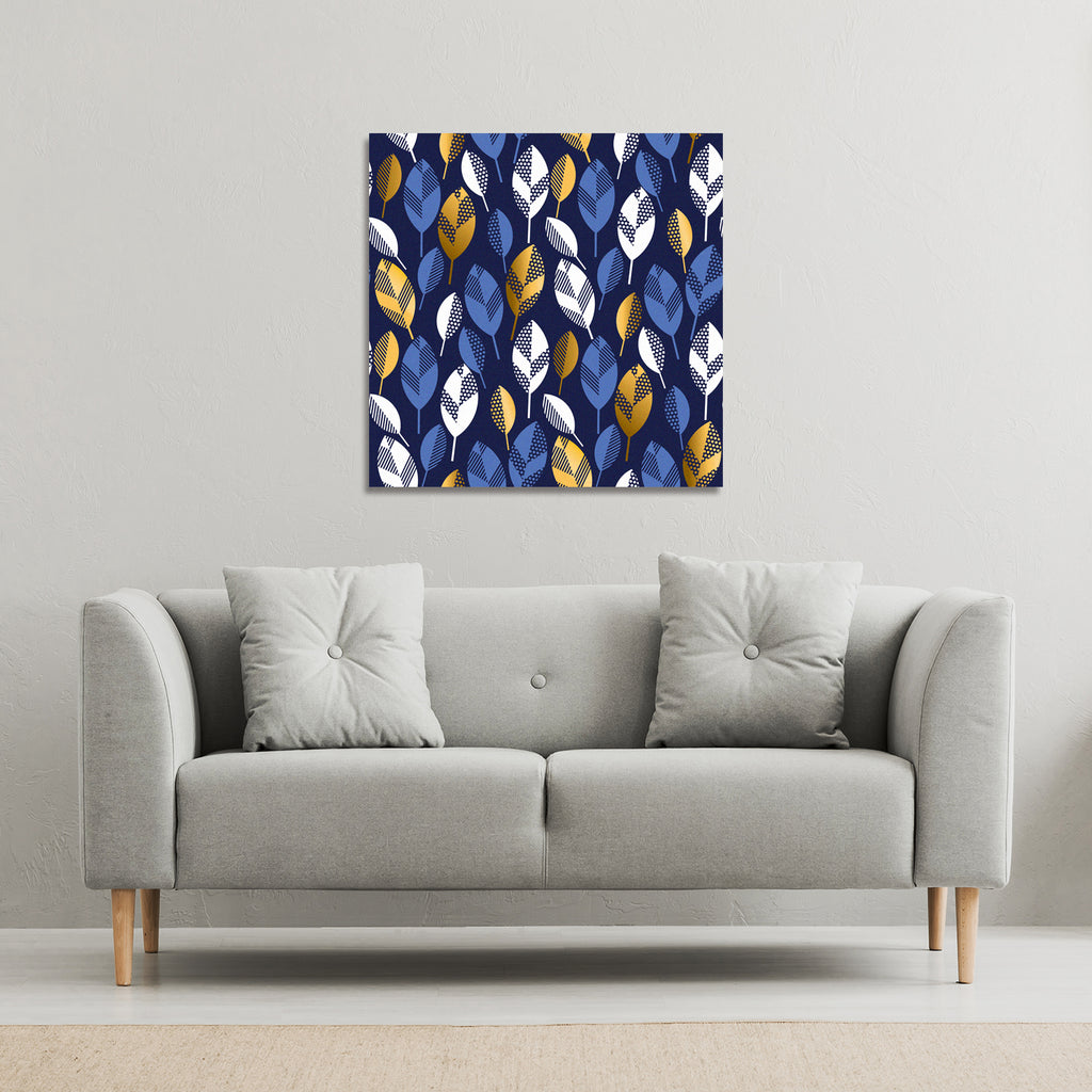 White, Blue & Gold Leaves on Navy Background (Canvas Print)