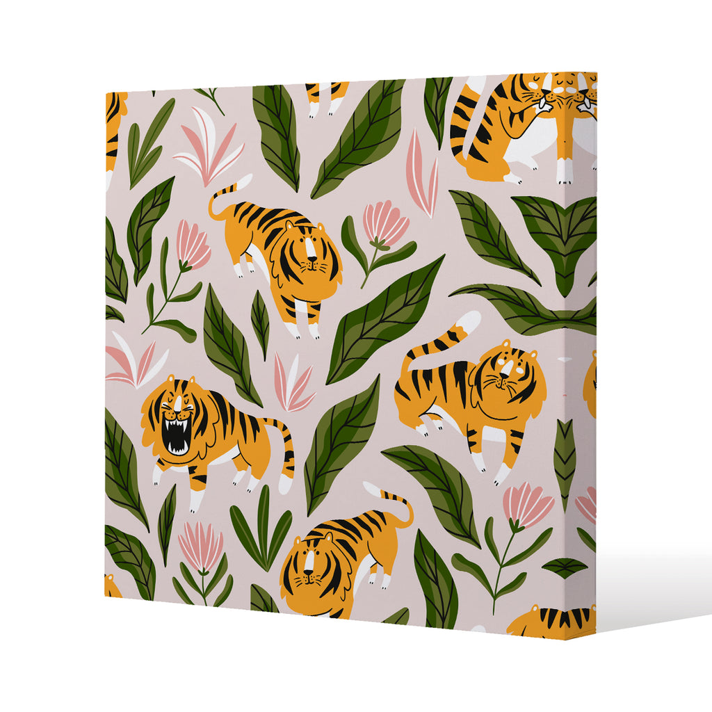 cute tigers and tropical leaves and flowers (Canvas Print)
