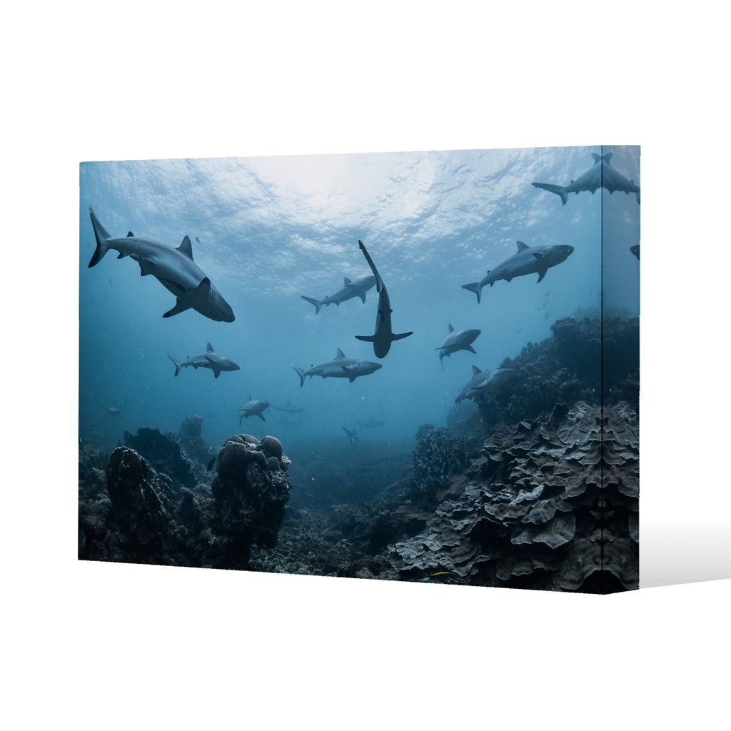 Schooling grey reef sharks, Ningaloo reef, Western Australia (Canvas Print)