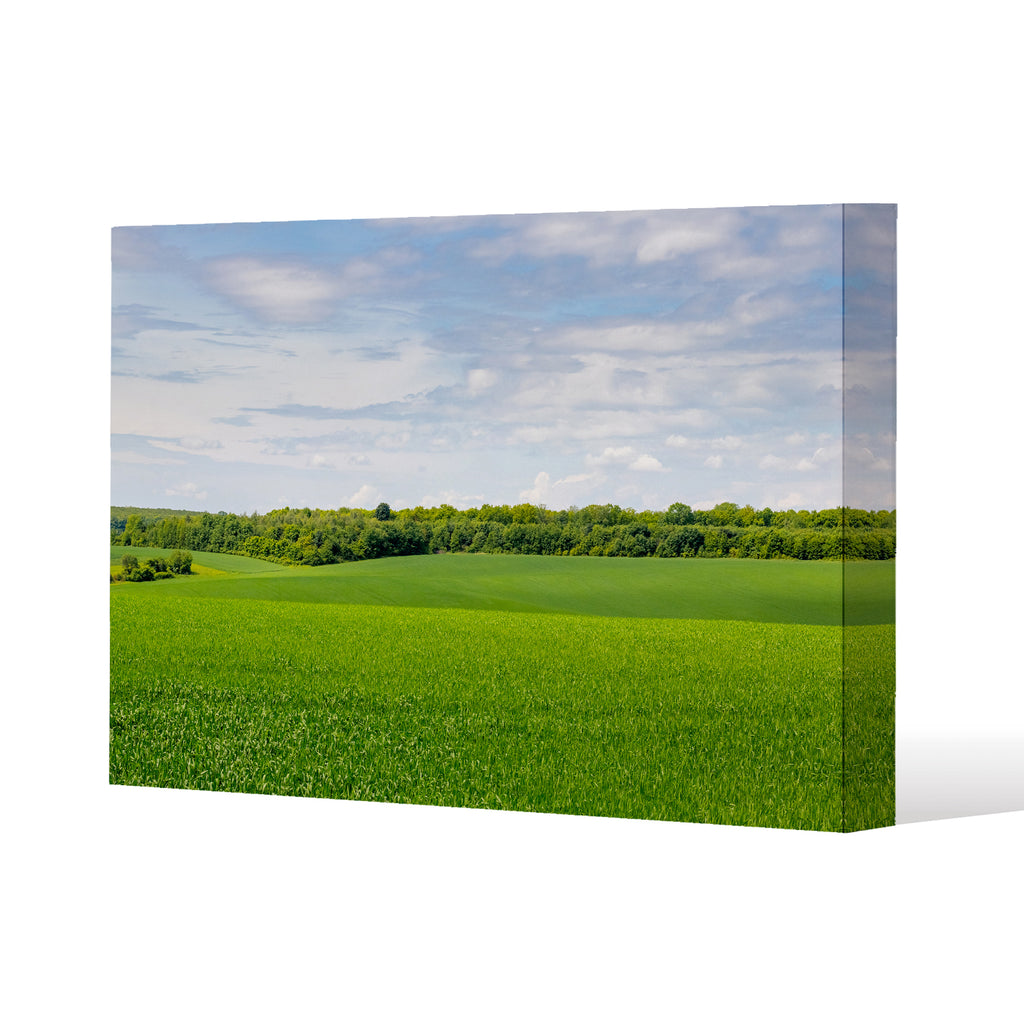 Summer landscape with hilly green field and forest in the distance (Canvas Print)
