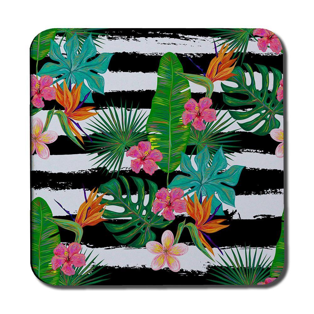 Tropical Plants on Black & White Stripes (Coaster)