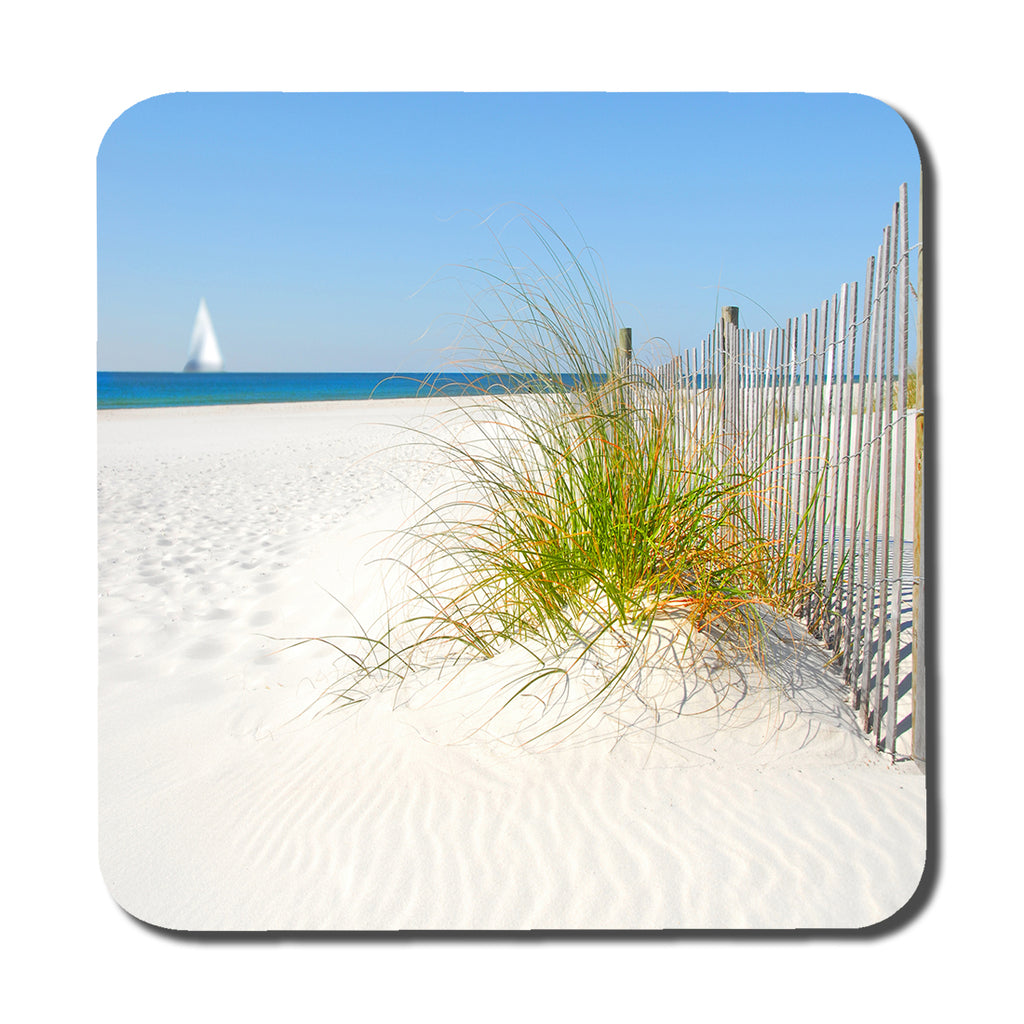 Beautiful sand dune fence by sea grass with sailboat on horizon (Coaster)
