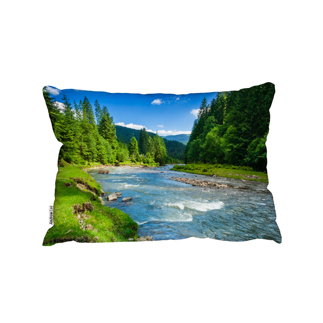 Landscape With Mountains, Forest And A River In Front. Beautiful Scenery (Cushion)