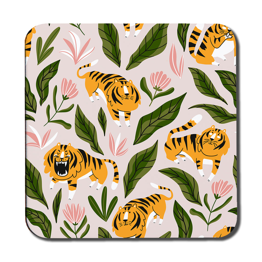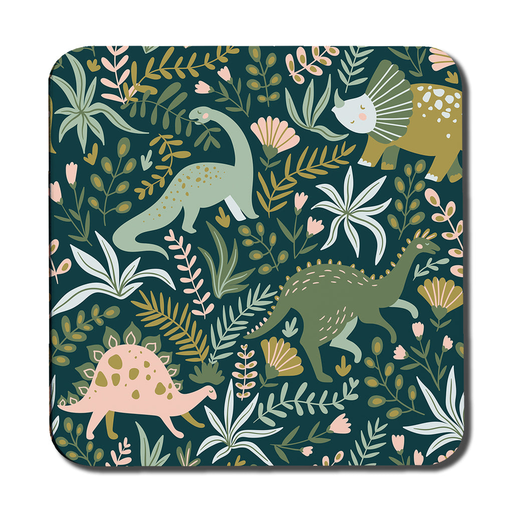 Hand drawn dinosaurs and tropical leaves and flowers. (Coaster)