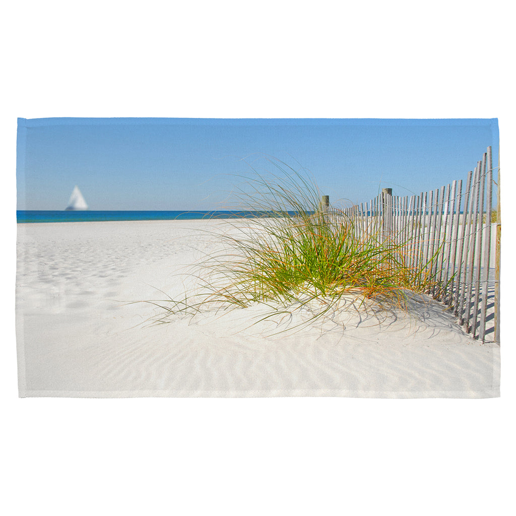 Beautiful sand dune fence by sea grass with sailboat on horizon (Kitchen Towel)