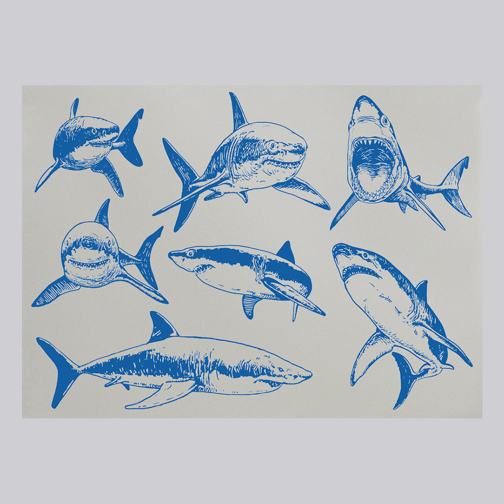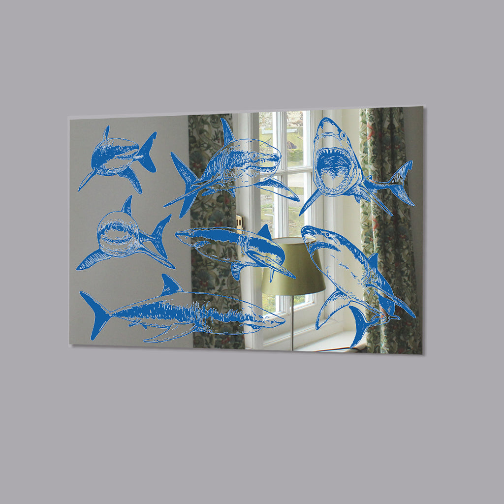 Graphical set of blue sharks isolated on white background (Mirror Art Print)