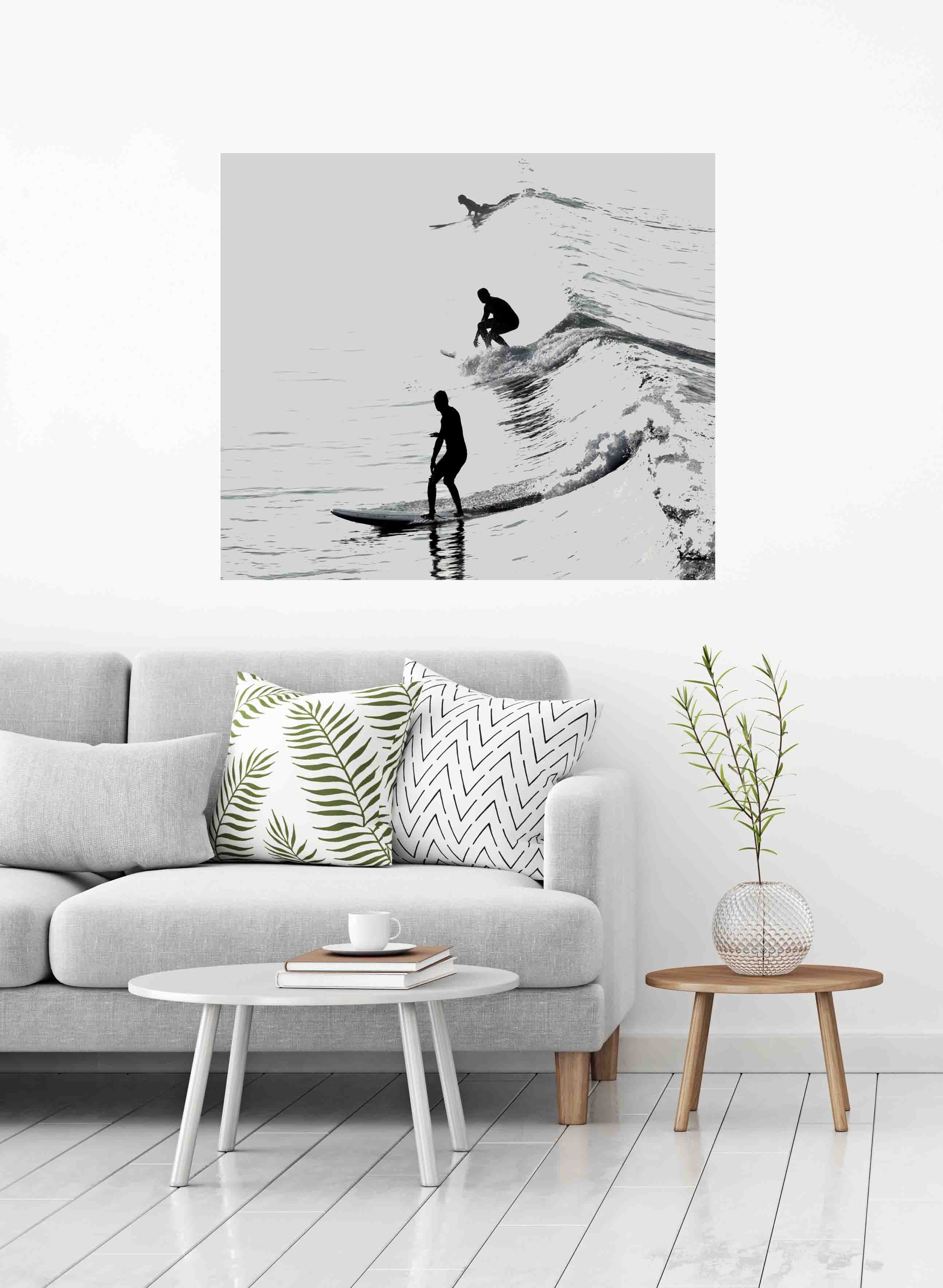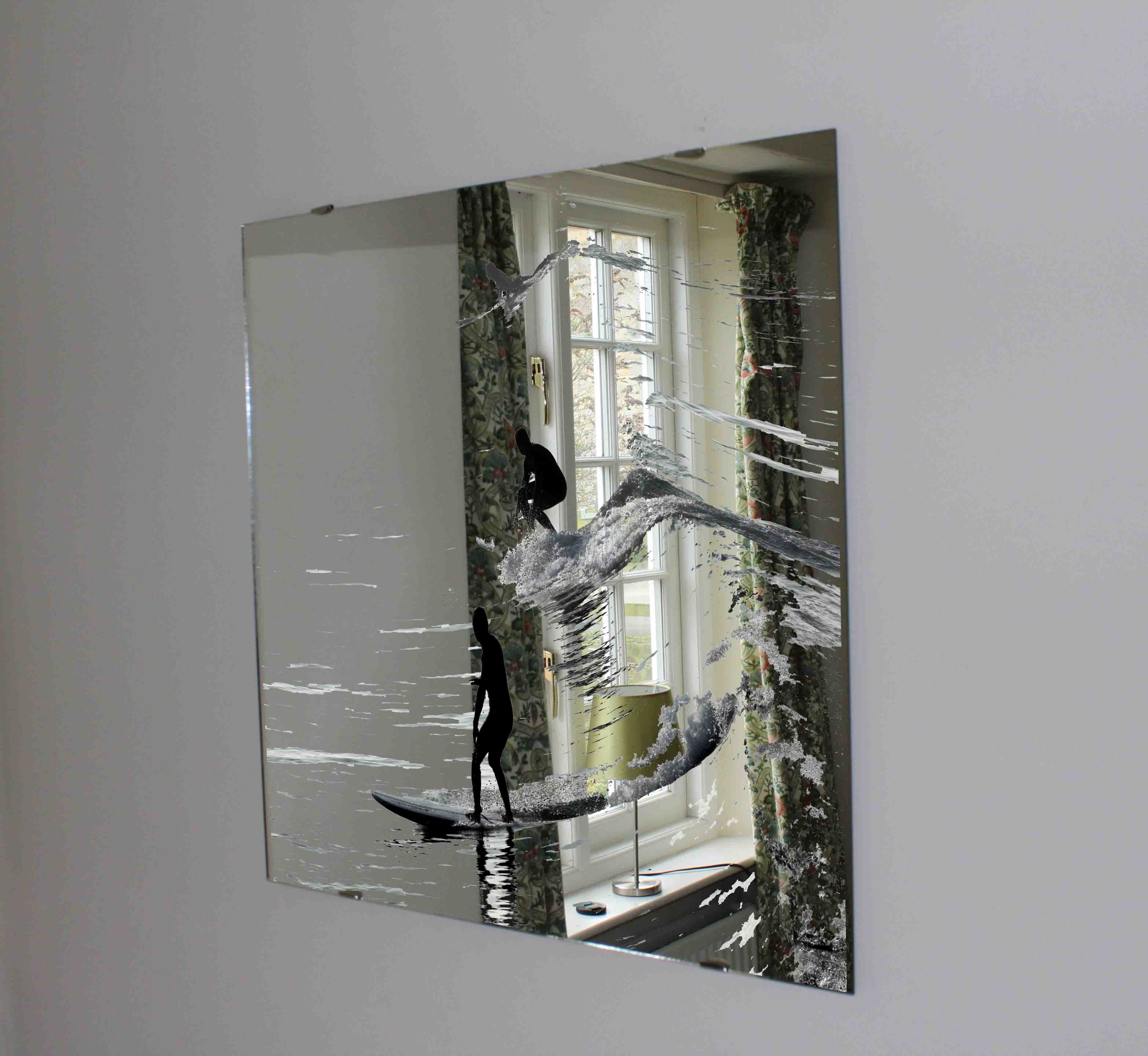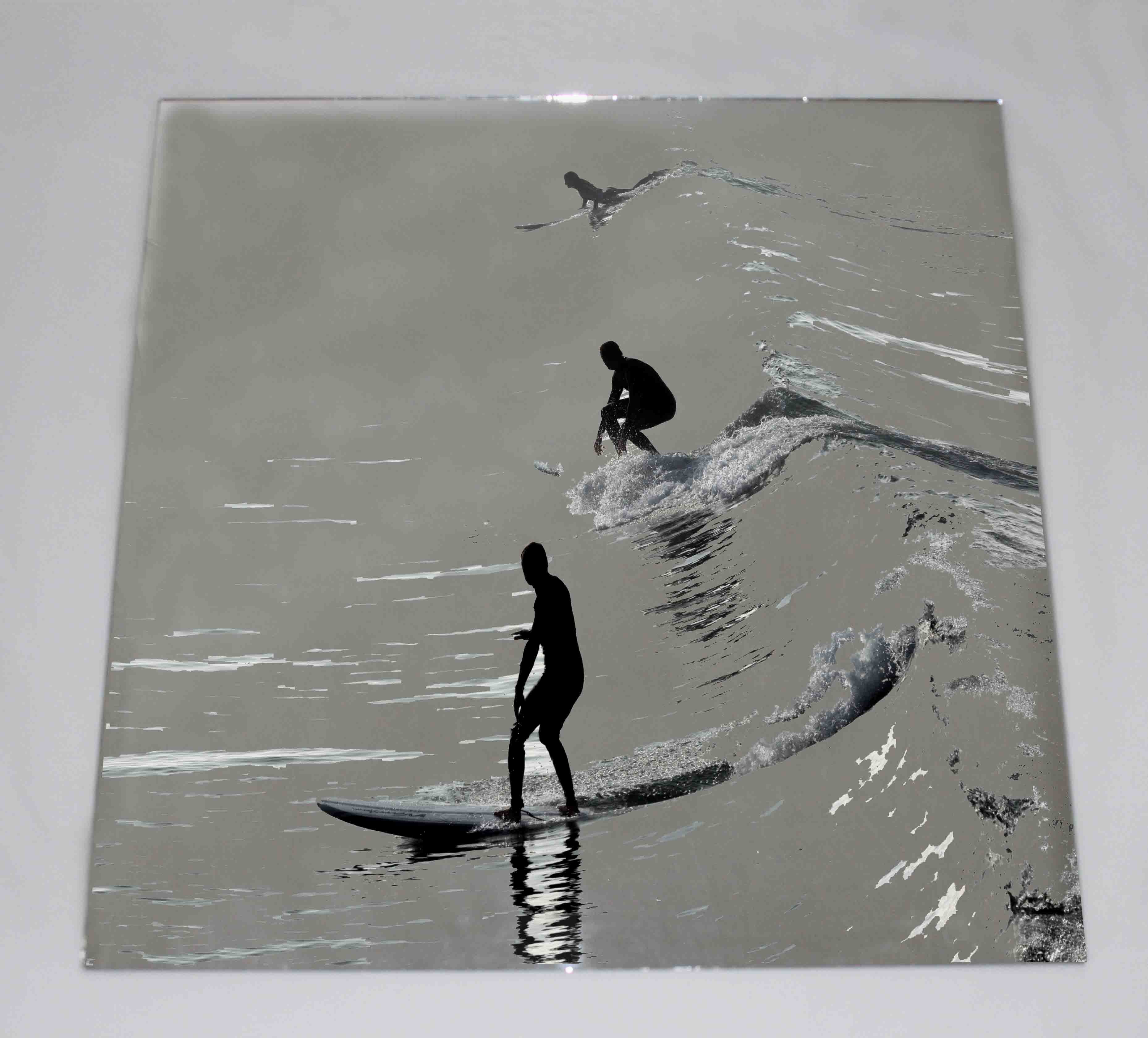 Three silhouettes of surfers (Mirror Art print)