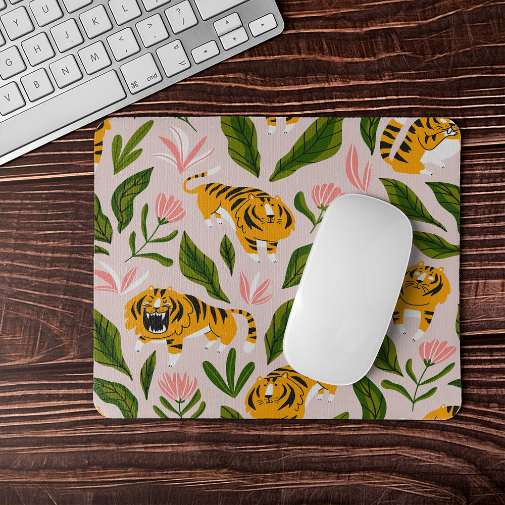 Cute tigers and tropical leaves and flowers Designer Mouse Mat is backordered and will ship as soon as it is back in stock.