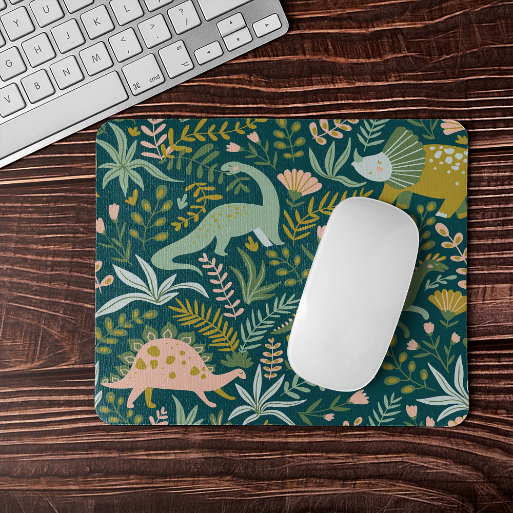 Hand drawn dinosaurs and tropical leaves and flowers. Designer Mouse Mat is backordered and will ship as soon as it is back in stock.