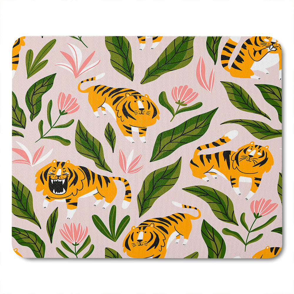 Cute tigers and tropical leaves and flowers Designer Mouse Mat