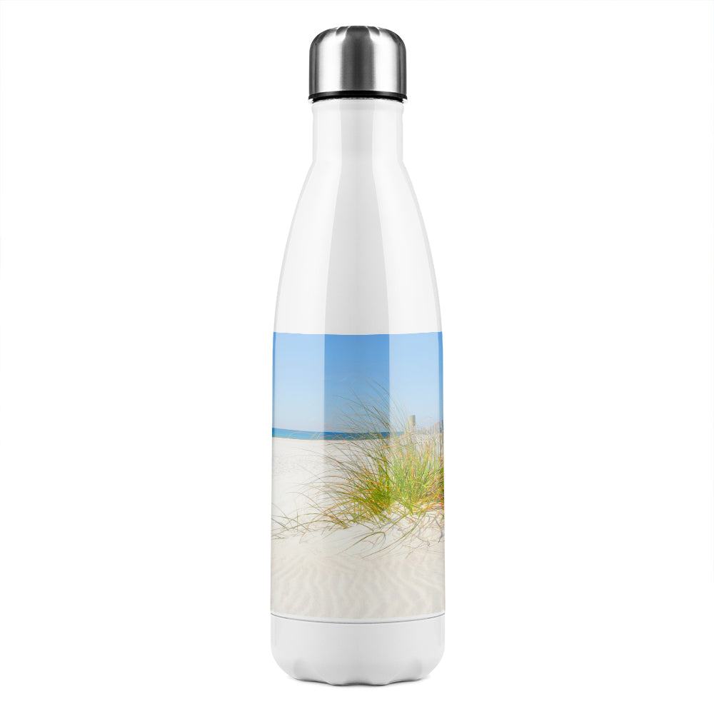 Dune fence by sea grass with sailboat on horizon Designer Stainless Steel Bottle