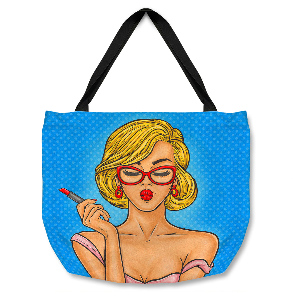 Pop art illustration woman paints her lips Designer Tote bag