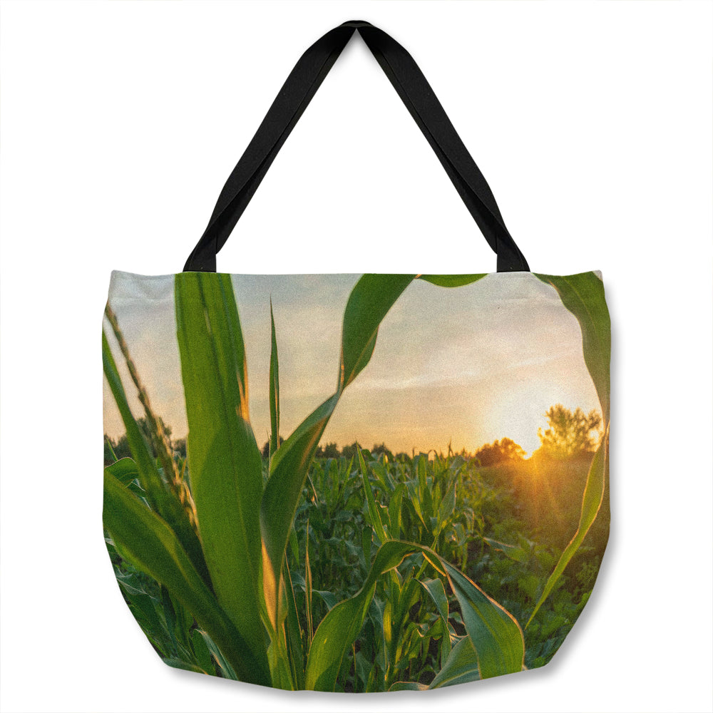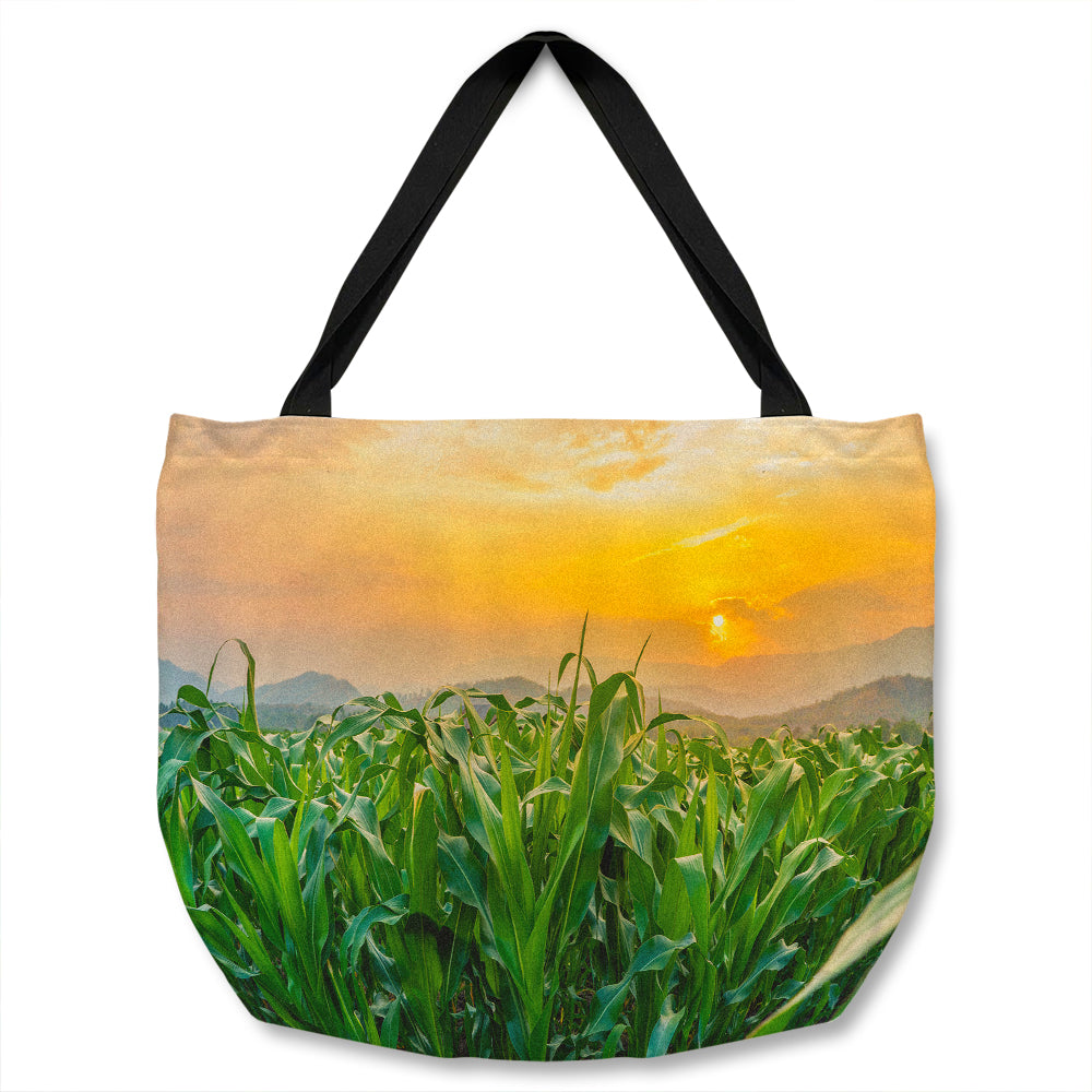 Green corn field in agricultural sun Designer Tote bag