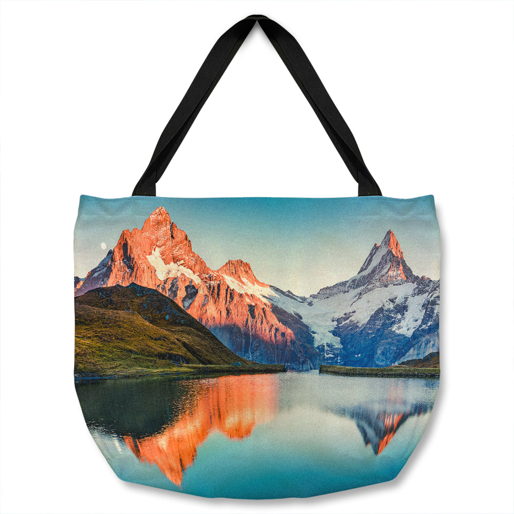 Fantastic evening panorama of Bachalp lake Designer Tote bag