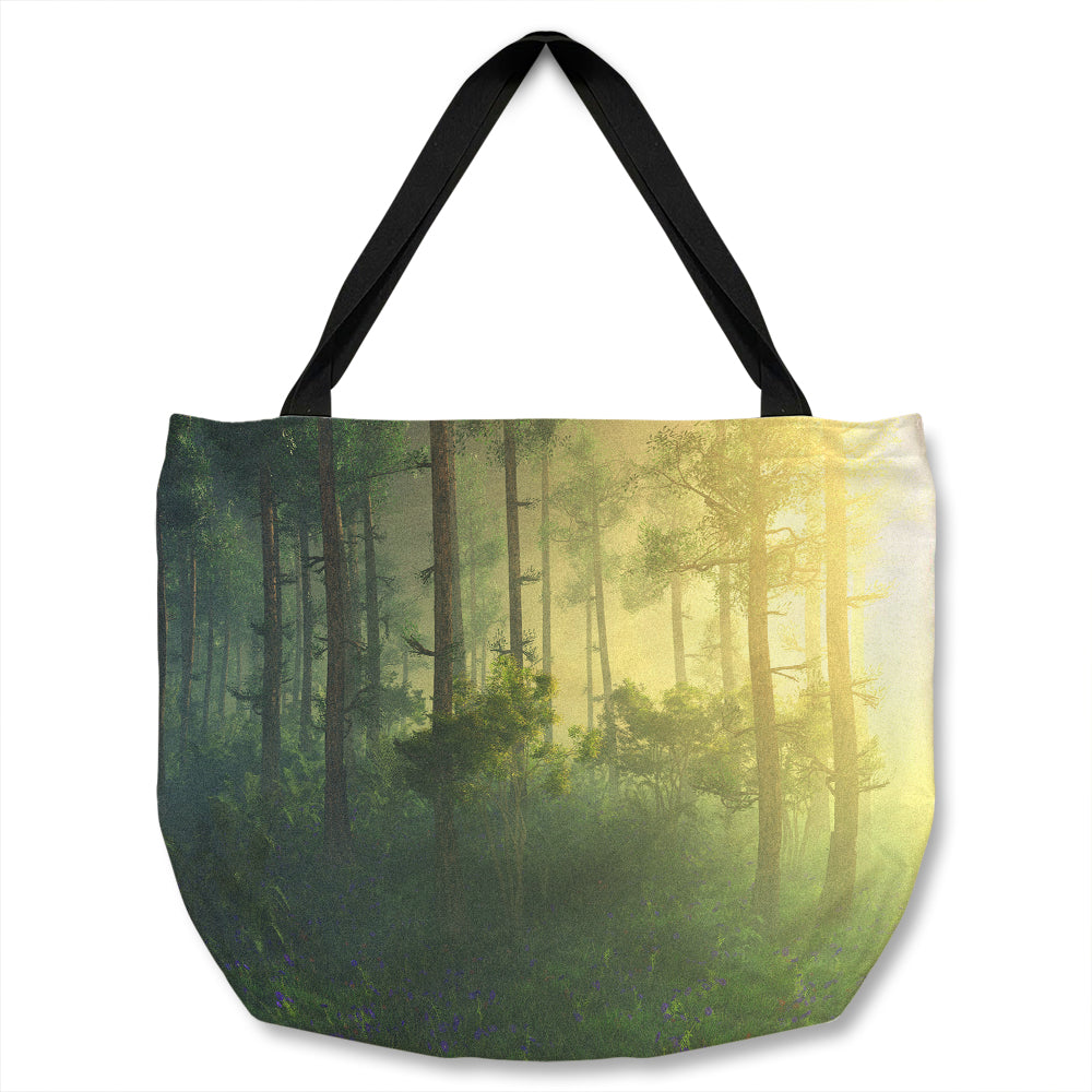 Sun, trees in a haze of light, glowing fog among the trees Designer Tote bag