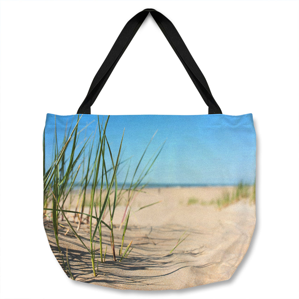 Grass in the sand dunes with the lake in the background Designer Tote bag