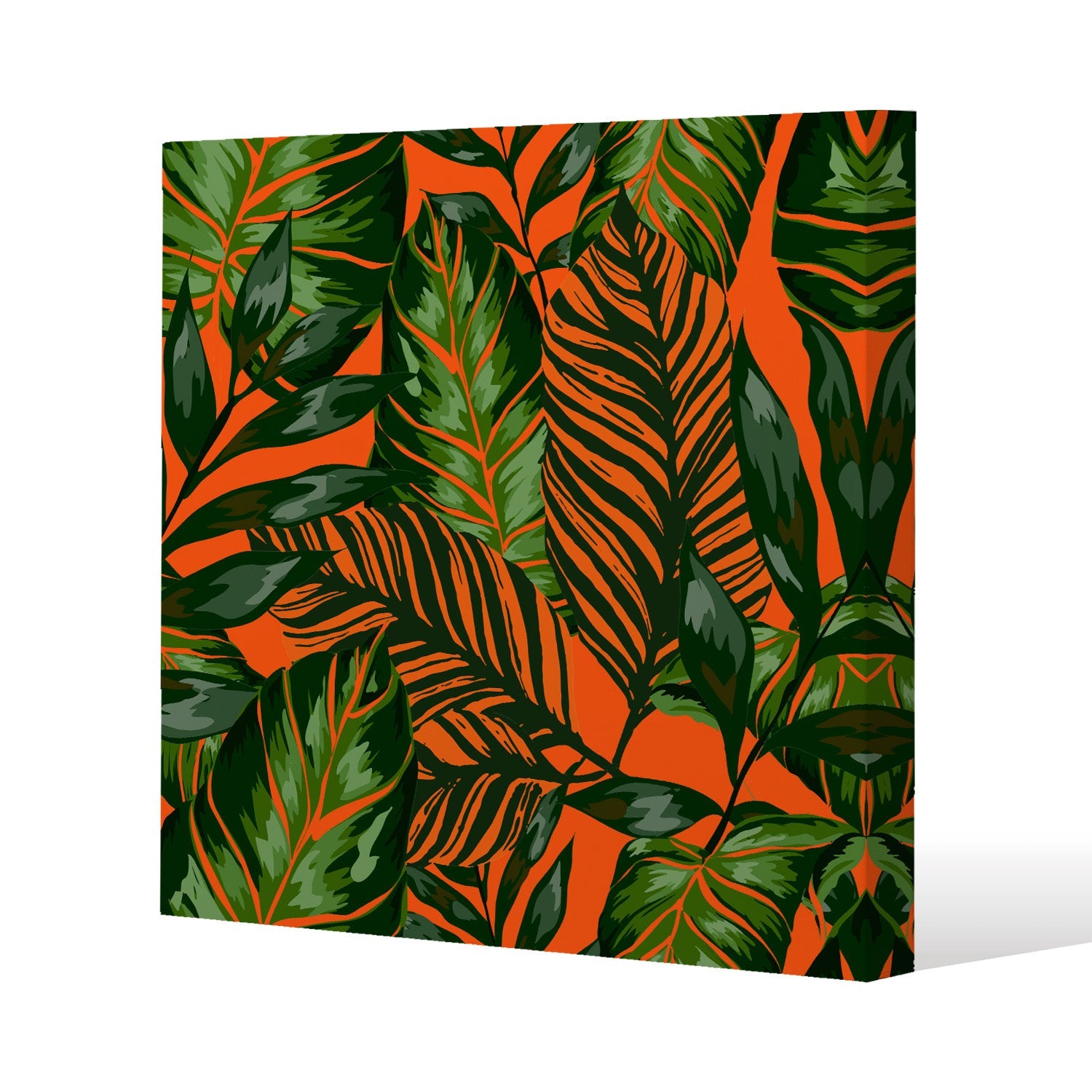Green Tropical Leaves on Orange Slim Style Canvas Print 20x20cm , 15mm Slim Real wood.